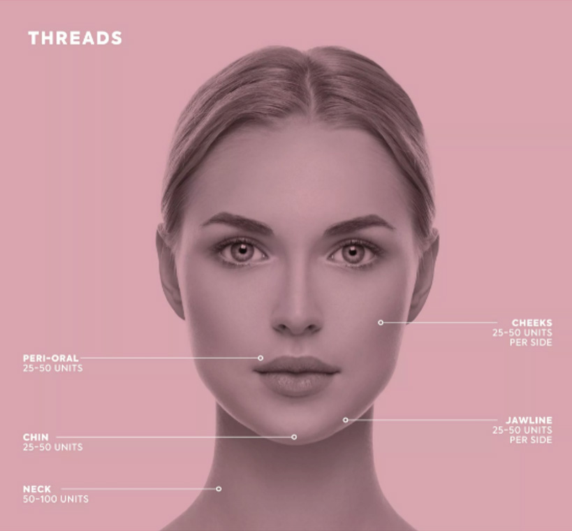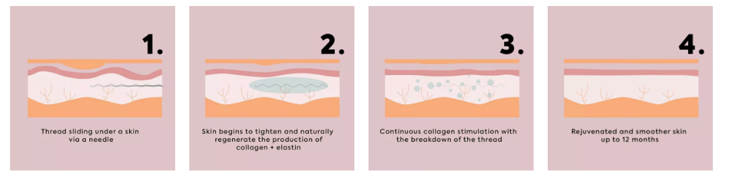 Fine needles containing threads are inserted into the skin. The fine needles are then removed leaving the fine thread underneath the skin. The mono threads stimulate an increase in collagen production which takes approximately 12 weeks to occur.